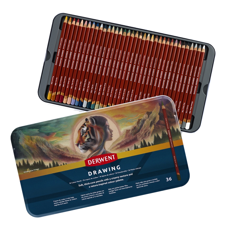 Derwent Drawing Pencil 36'lı çizim kalem seti, sanatçıların özellikle doğal, toprak ve canlı yaşam temalı çizimler için tercih ettiği, yumuşak ve kremsi dokulu profesyonel bir settir.