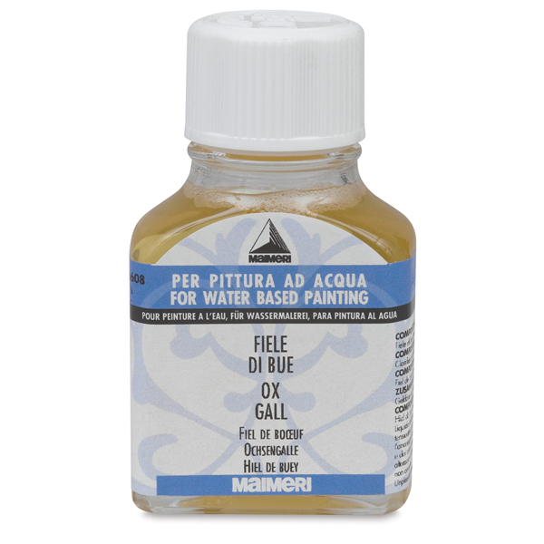 Maimeri Ox Gall, 75ml'lik şişelerde sunulan, özellikle suluboya ve guaj gibi su bazlı boyalar için geliştirilmiş bir sanat medyumu (yardımcı malzemedir).