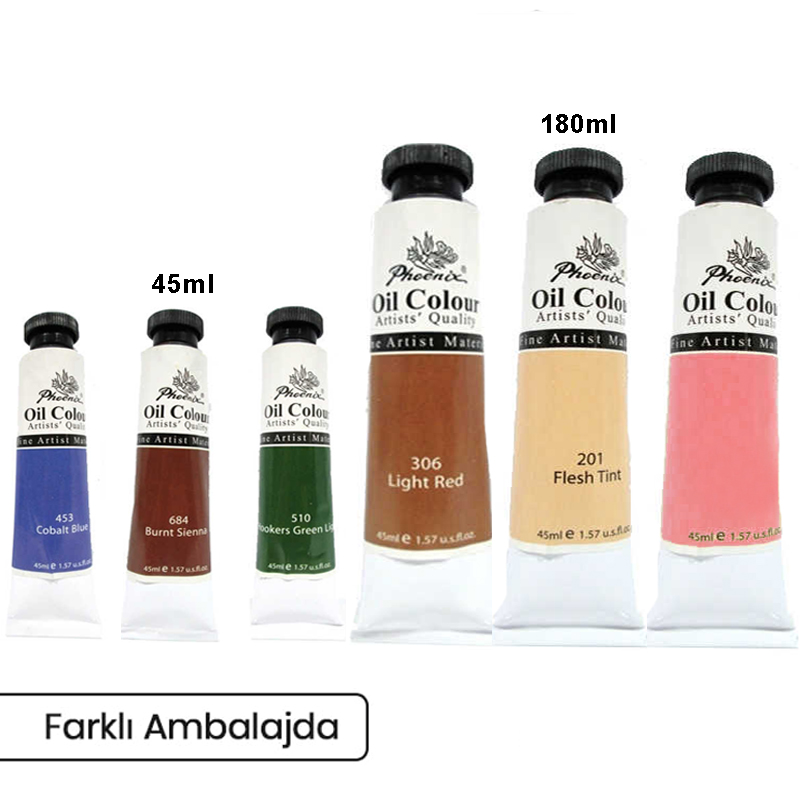 Phoneix yağlıboyalar 45 ml ve 180 ml tüplerde satışa sunulmuştur.