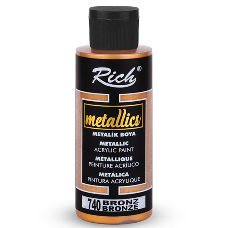 Rich Akrilik Metalik Boya 120mlRich Metalik akrilik grubu dekorasyon ve sanatsal hobi çalışmalarında kullanılan su bazlımetalik görünüm kazandıran boyalardır.Sağlığa hiçbir zararıolmayan yüksek kalitesiyle darbelere silinmelere, sürtünmelere karşıoldukça dayanıklıdır.Ahşap, cam, seramik, mdf, tuval ve polyester gibi farklıyüzeylerde de rahatlıkla kullanılabilir.Rich metalik akrilikler 50 ayrırenk yelpazesi olup kendi içlerinde de karıştırılabilir. Rich metalik akrilikler yapısıgereği su bazlıve solvent bazlıvernikler ile çalışmaya uygundur. Tavsiye edilen 2 kat uygulanmasıdır.