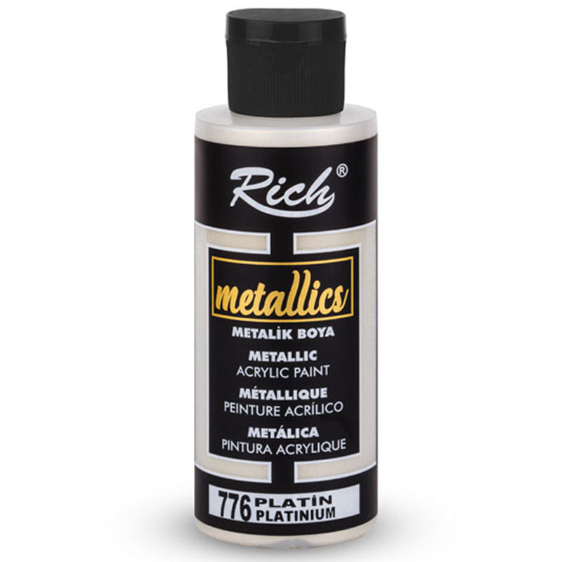 Rich Akrilik Metalik Boya 120mlRich Metalik akrilik grubu dekorasyon ve sanatsal hobi çalışmalarında kullanılan su bazlımetalik görünüm kazandıran boyalardır.Sağlığa hiçbir zararıolmayan yüksek kalitesiyle darbelere silinmelere, sürtünmelere karşıoldukça dayanıklıdır.Ahşap, cam, seramik, mdf, tuval ve polyester gibi farklıyüzeylerde de rahatlıkla kullanılabilir.Rich metalik akrilikler 50 ayrırenk yelpazesi olup kendi içlerinde de karıştırılabilir. Rich metalik akrilikler yapısıgereği su bazlıve solvent bazlıvernikler ile çalışmaya uygundur. Tavsiye edilen 2 kat uygulanmasıdır.