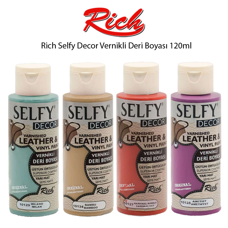 Rich Selfy Decor Vernikli Deri Boyası, özellikle deri ve benzeri esnek yüzeyleri yenilemek veya rengini değiştirmek için tasarlanmış, su bazlı, yeni nesil bir hobi ve dekorasyon boyasıdır.