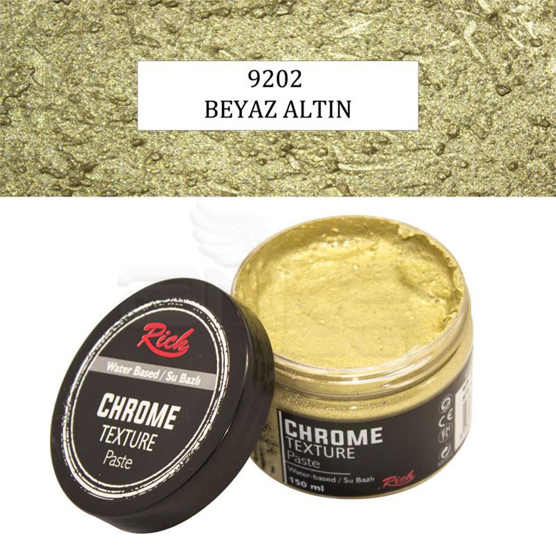 Rich Su BazlıChrome Texture Paste 150mlSu bazlıdır. Tüm sert yüzeylerde kullanılabilir.Serbest desen ve stencil kabartma çalışmalarıiçin uygundur.Spatula, fırça veya sünger ile kullanılır.Özel granürlü yapısısayesinde dokulu bir zemin elde edilmesini sağlar. Sağlığa zararlımadde içermez.