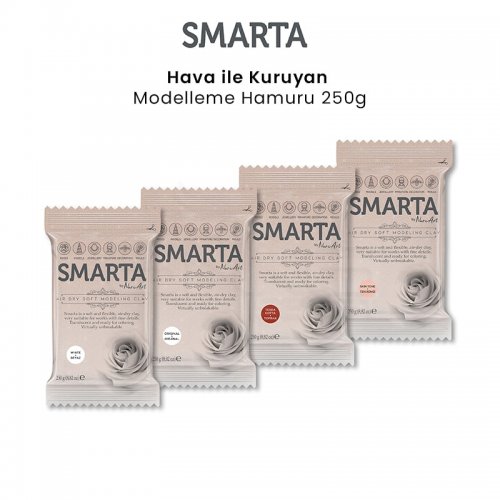 Smarta Hava ile Kuruyan Modelleme HamurSmarta Modelleme Hamuru, her türlü hobi, eğitim ve profesyonel amaçlıçiçek, dekor, aksesuar, takı, minyatür ve sanatsal aranjman yapabileceğiniz özel bir hamurdur.Smarta Hava ile Kuruyan Modelleme Hamuru Ön hazırlık gerektirmez, yumuşaktır, kolayca şekillendirilir ve ele yapışmaz.Hava ile kurur, fırınlama gerektirmez. Özel formülü sayesinde esnek ve dayanıklıdır.Kuruduktan sonra akrilik boya ile boyanabilir.Boyama işleminden bir gün sonra verniklenebilir.Küçük ölçekli modeller rahatlıkla çalışılabilir. Model çiçekler, aksesuarlar, dekoratif objeler, takılar ve daha birçok çalışma için uygundur.Farklırenk Smarta hamurlarıkarıştırılıp yeni renkler elde edilebilir. Yarısaydam ve beyaz renk hamurlar akrilik boya, yağlıboya veya toz boya ile renklendirilebilir.Yaşam alanınızıgüzelleştirmek veya nişan, düğün, doğum gibi özel günlerinizde bırakmak istediğiniz unutulmaz anılar için özel çiçek buketleri oluşturun. Yapacağınız özel çiçek aranjmanlarıyla her anınıza değer katın ve geleceğe iz bırakın3 boyutlu tablodan takıkutusuna, peçetelikten fotoğraf çerçevesine kadar sayısız bir yelpazeden tarzınıza uyan dekoratif objeler elde edin.Hayallerinizi istediğiniz renklerle ve materyallerle kombinleyin ve sizi en iyi yansıtan takılarıyaratın.