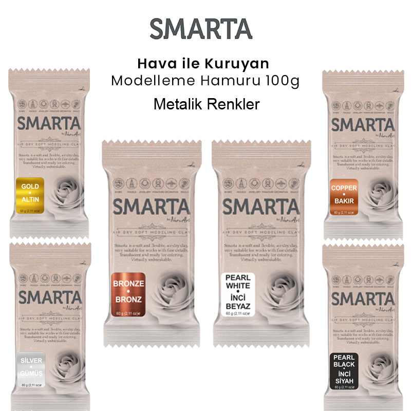 Smarta Modelleme Hamuru, her türlü hobi, eğitim ve profesyonel amaçlıçiçek, dekor, aksesuar, takı, minyatür ve sanatsal aranjman yapabileceğiniz özel bir hamurdur.Ön hazırlık gerektirmez, yumuşaktır, kolayca şekillendirilir ve ele yapışmaz.Hava ile kurur, fırınlama gerektirmez. Özel formülü sayesinde esnek ve dayanıklıdır.Küçük ölçekli modeller rahatlıkla çalışılabilir. Model çiçekler, aksesuarlar, dekoratif objeler, takılar ve daha birçok çalışma için uygundur.Farklırenk Smarta hamurlarıkarıştırılıp yeni renkler elde edilebilir. Yarısaydam ve beyaz renk hamurlar akrilik boya, yağlıboya veya toz boya ile renklendirilebilir.Yaşam alanınızıgüzelleştirmek veya nişan, düğün, doğum gibi özel günlerinizde bırakmak istediğiniz unutulmaz anılar için özel çiçek buketleri oluşturun. Yapacağınız özel çiçek aranjmanlarıyla her anınıza değer katın ve geleceğe iz bırakın3 boyutlu tablodan takıkutusuna, peçetelikten fotoğraf çerçevesine kadar sayısız bir yelpazeden tarzınıza uyan dekoratif objeler elde edin.Hayallerinizi istediğiniz renklerle ve materyallerle kombinleyin ve sizi en iyi yansıtan takılarıyaratın.